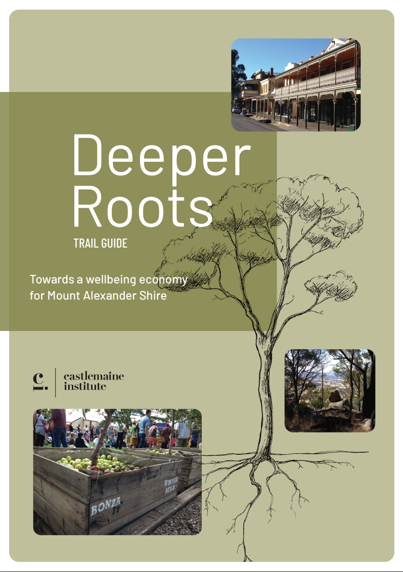Publications Deeper Roots: Trail GuideTowards a Wellbeing Economy for Mount Alexander Shire Download Retrofitting for ResilienceHow to retrofit housing for climate resilience as well as energy efficiency. Download WilderhoodsBringing neighbourhoods together to create thriving habitat for humans and wildlife. Download Cool-it Tree SelectionSelecting street trees for long-term climate resilience. Read more » Download Housing retrofits workbook Download The Wararack EconomyA vision of what our local economy could look like in 2040 if we took the path of a regenerative economy. Download The Price of CapitalismAn analysis of our current economic system, with some thoughts about how it might be improved. Download